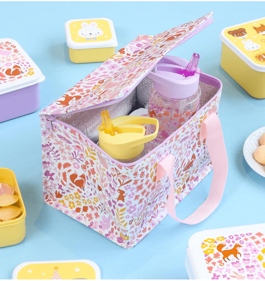 The lilac cool bag with flowers and little foxes is perfect to keep your lunch and drinks cool. The cool bag offers enough space for our bento lunch box, snacks, a water bottle and a piece of fruit. The cool bag is made of recycled plastic.