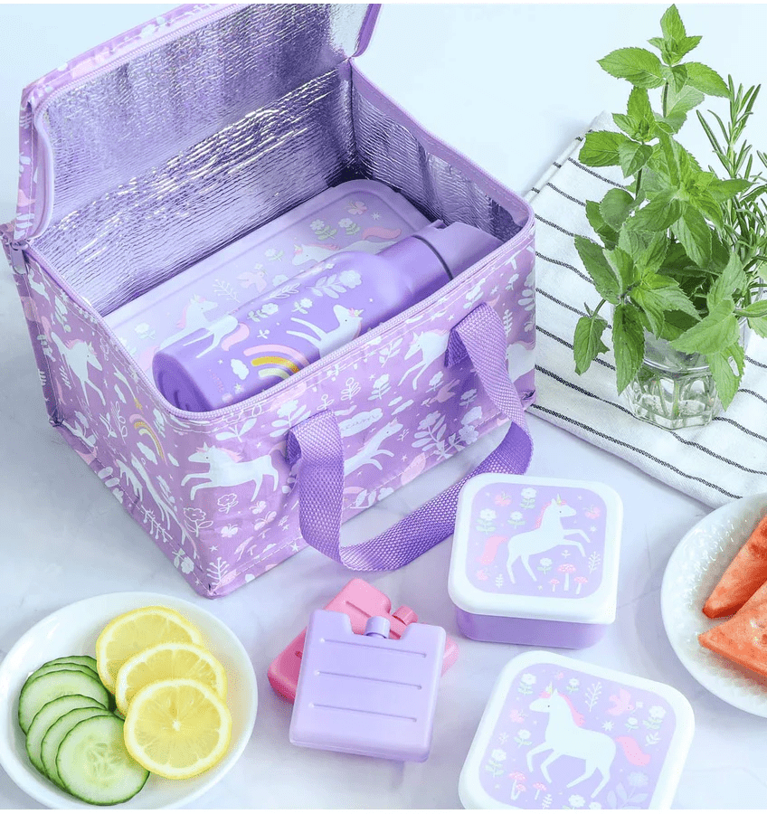 The purple cool bag with Unicorn Dreams design is perfect to keep your lunch and drinks cool. The cool bag offers enough space for our bento lunch box, snacks, a water bottle and a piece of fruit. The cool bag is made of recycled plastic.